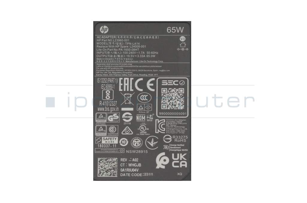 Cargador 65 vatios normal con adaptador original para HP Envy x360 13-ar0600